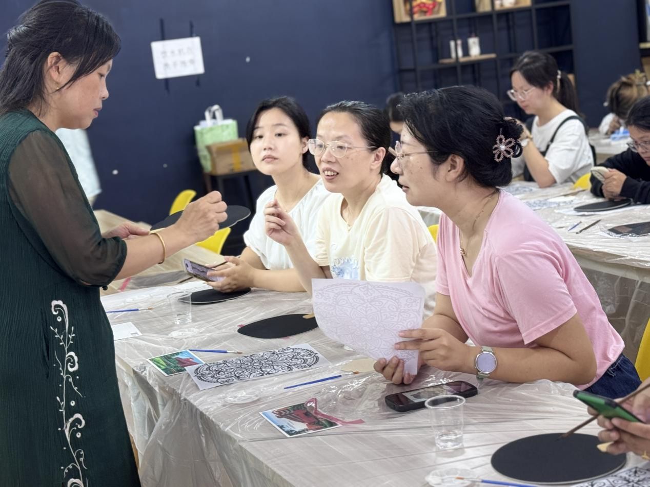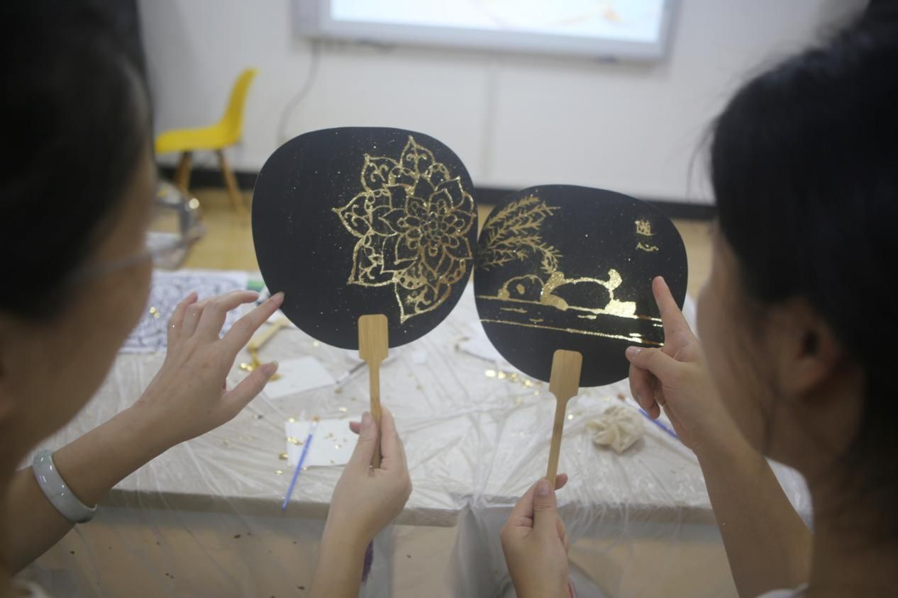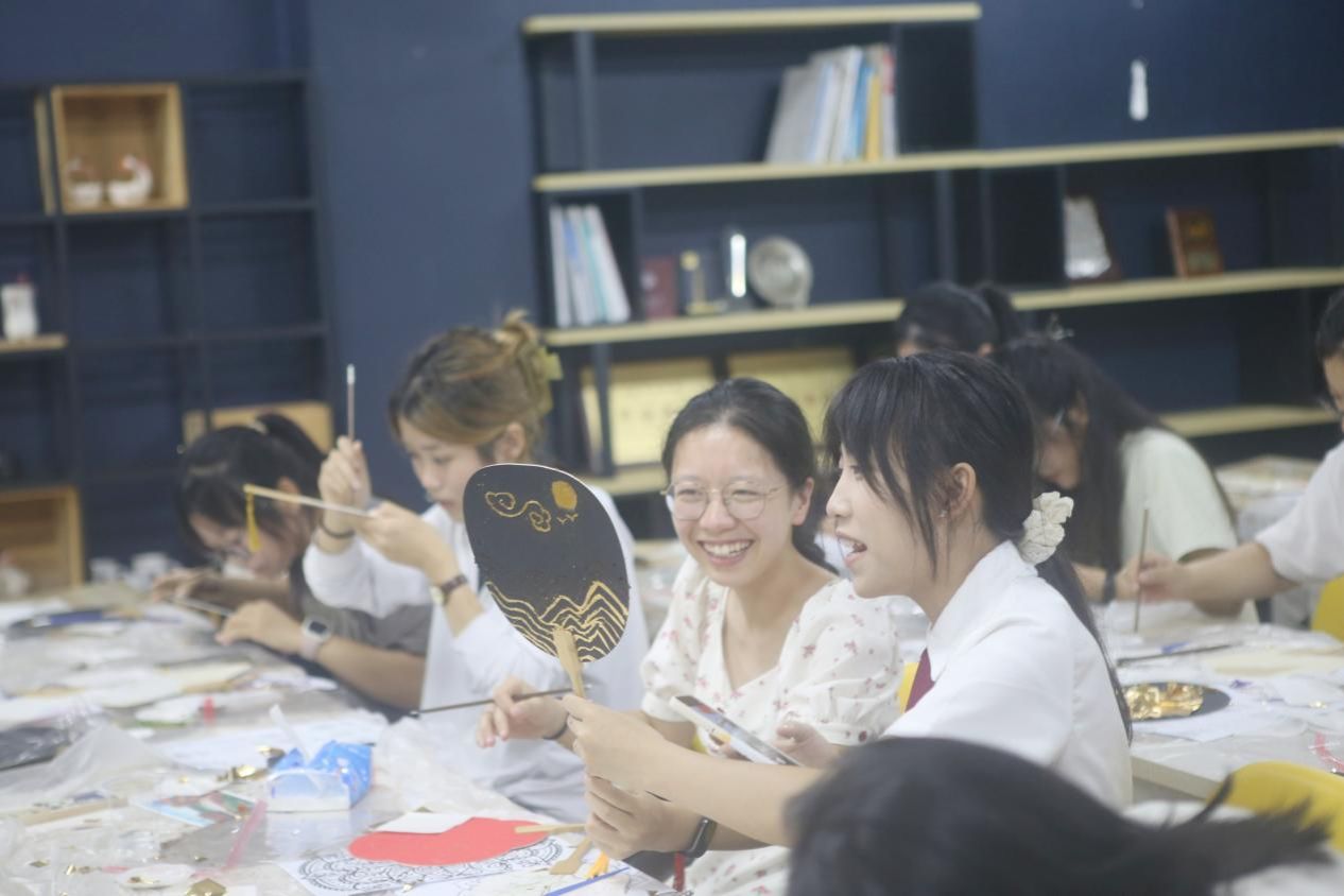 的师生们化身为匠人,手持细笔,轻蘸金漆,于扇面之上勾勒出一幅幅精致图案。每一笔,都蕴含着对传统文化的敬畏与传承;每一划,都闪耀着创意与灵感的火花。从素扇到漆金扇的华丽蜕变,不仅是技艺的展现,更是心灵的触碰与对话。在这里,我们共同见证了古老技艺的新生,让这份美好得以延续。