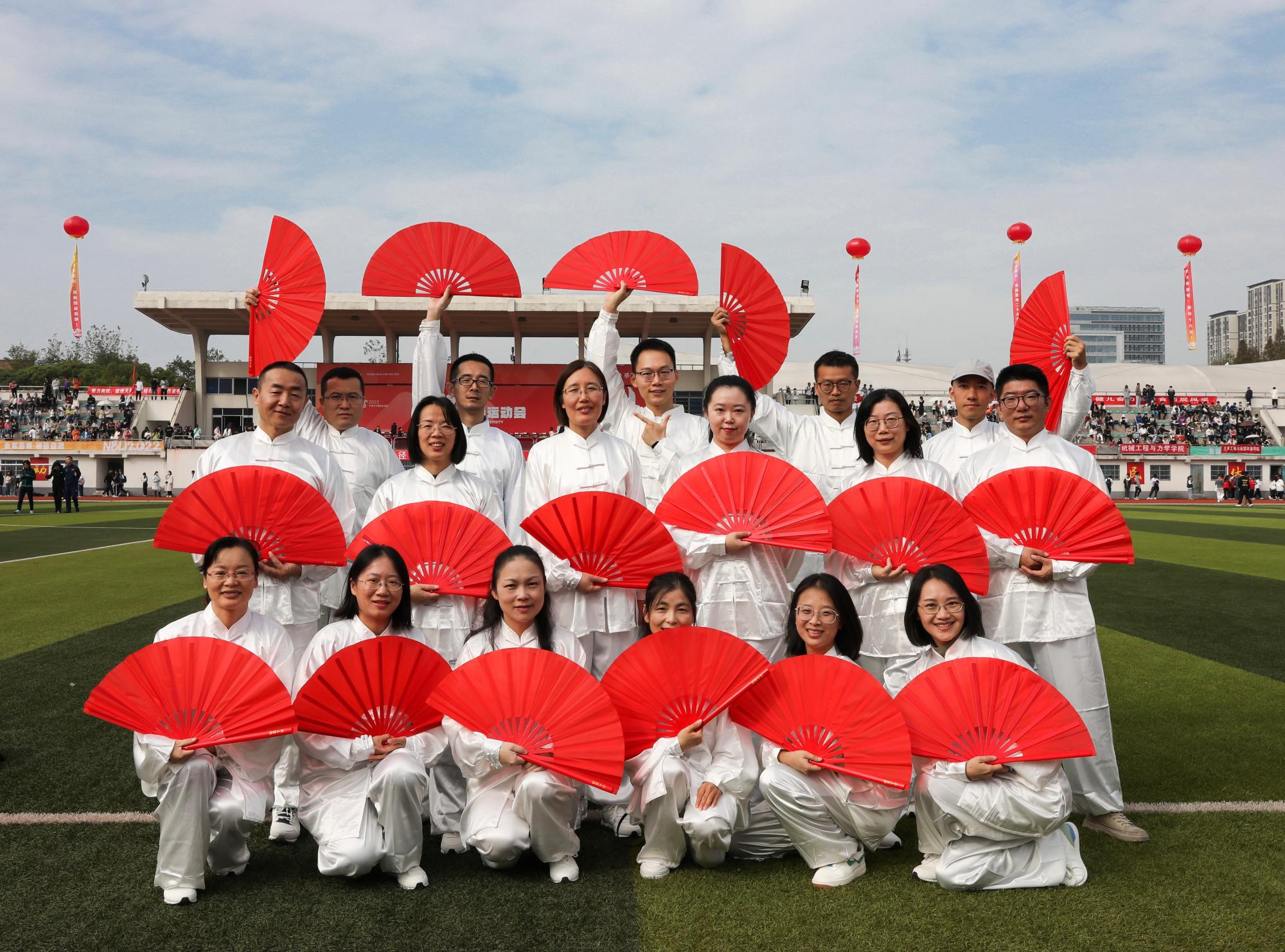 校运会开幕式上进行太极功夫扇展演。整齐统一的服装,规范熟练的动作,刚柔并济的表演,为在场师生献上了赏心悦目的太极盛宴,也充分展现了人文学院教职工昂扬向上的精神风貌和中国传统文化的独特魅力。