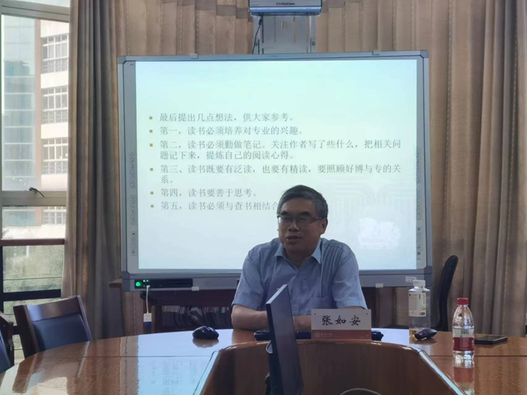 退休教授,硕士生导师,张如安教授应邀作了题为“治学门径与科学研究经验漫谈”的讲座,讲座由罗紫鹏老师主持。