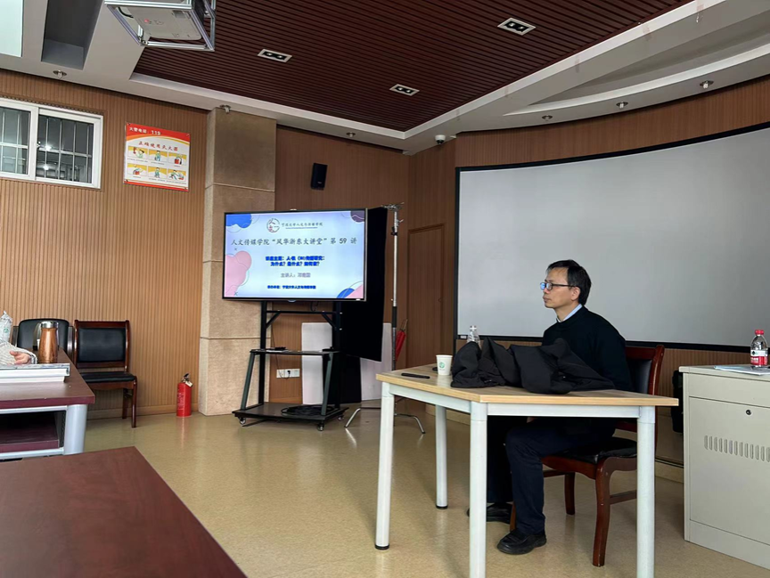 讲座伊始,邓建国教授通过某医院病患家属踢翻人工智能助手的新闻,告诉我们AI在程序员进行算法设计的时候就产生了文化差异,为我们引入了今天的主题。邓教授列举AI可以具有情感支持、病患照料等功能,并以ChatGpt为例,介绍其作为人工智能伴侣而被需要,但AI始终不能代替人类之间亲切的对话,从而指出了彼得斯“身体重新回归”的重要性。然后,邓教授从技术哲学的视角,为我们介绍了东西方传播观念的差异,在此基础上,对彼得斯在《对空言说》中的一些观点作了解释,邓教授指出,人类传播虽然有种种沟壑,但是我们还是很有可能达到心灵上的对话和融合,这种沟壑的存在是我们寻求沟通交流永远的动力。