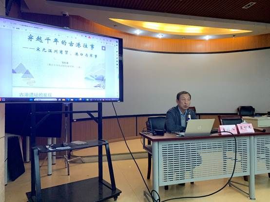讲座伊始,吴教授介绍了古港遗址的发现。他指出,温州考古发现了令世人惊叹的码头遗址和海量的宋代瓷器碎片,温州学者围绕这一些开始进行多方面的讨论。这一码头遗址是表明宋元时期的温州人对外大规模交往,大力发展海外贸易,善于航海、善于造船并参加国家海军建设,人多地少、粮食不足,灾年必须从外地运入大量粮食发展多种经济,许多产品运往各地。随后,吴教授介绍了温州宋元造船业之发达,按照时间顺序讲述了温州造船业辉煌的发展史,嘉定年间的“转板”技术在当时应属于温州首创。南宋温州的海船,大部分是民间所造,温州民间造船业的水平高、造船能力强。元代温州仍是重要的造船基地。世祖至元年间元军准备南下攻打爪哇国, 其中一些战船便在温州制造。吴教授总结了南宋温州海外贸易繁荣有多方面的原因:第一, 南宋全国海上贸易大开放的格局;第二, 临安是南宋的首都, 拉动了东南一带的商品流通;第三, 中国最大的贸易港从广州移到泉州, 温州靠近泉州, 便于到东南亚甚至更远方向的贸易提供了方便;第四, 浙闽两路已形成稠密的贸易网络, 吸引商人来经商。大观通宝和赵佶手书、南宋青釉褐彩鱼纹瓷洗、北宋青瓷观音菩萨坐像、北宋彩塑菩萨立像、北宋青瓷童子戏鱼纹粉盒等一系列文物都足以看出温州制瓷业发达、商业贸易繁荣。朔门古港遗址中发现了南宋沉船和元代瓷片堆积带都也足以证明此观点。