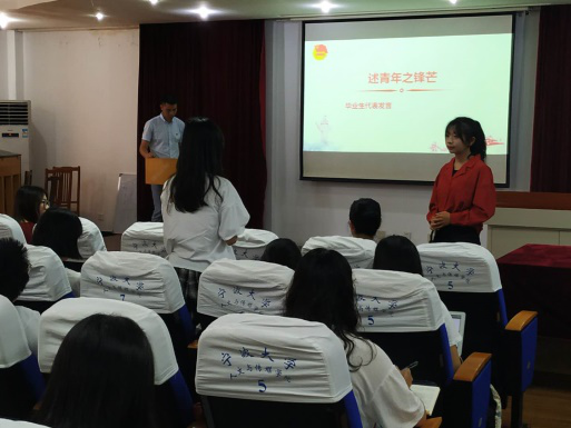 此次团课以部分毕业生回忆入学时感受与梦想、述说毕业时感受以及未来20年梦想为主要内容,并由“述青年之锋芒”、“数往昔之珍藏”“颂今日之离歌”“绘未来之蓝图”“赠师长之殷望”这五个环节构成。第一环节“述青年之锋芒”,由即将奔赴贵州支教的2019届毕业生曹佳菲做精彩发言。此环节后,现场对16级广告专业的吴鑫婷同学进行了采访,吴鑫婷表示非常佩服曹佳菲学姐选择支教的勇气,向学姐学习,争取做最好的自己。