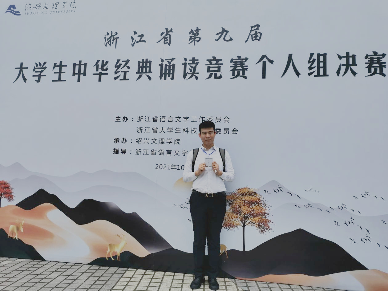 10月17日,浙江省第九届中华经典诵读竞赛个人组决赛在绍兴文理学院落下帷幕。历时六个月,经学院选拔,学校评选,省专家评审,由我院徐琼老师和杨桂珍老师精心指导的杨常乐、林煜轩同学分别获得一等奖、三等奖。