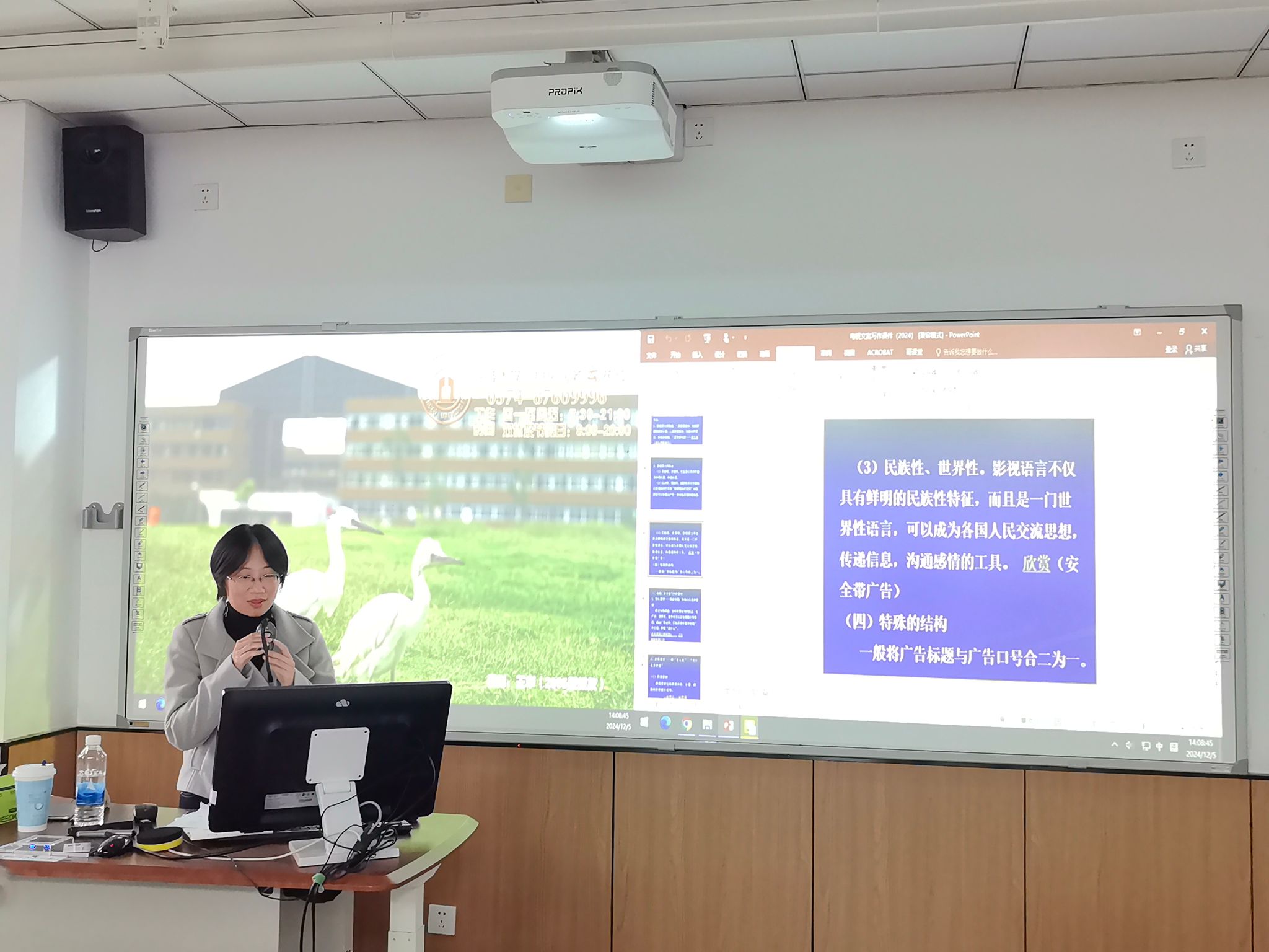 张颖老师面向全校讲授课程思政公开观摩课“广告文案写作”。学院副院长田力,学院教学督导屈广燕以及传播系副主任赖明东、陈宸等前来观摩。