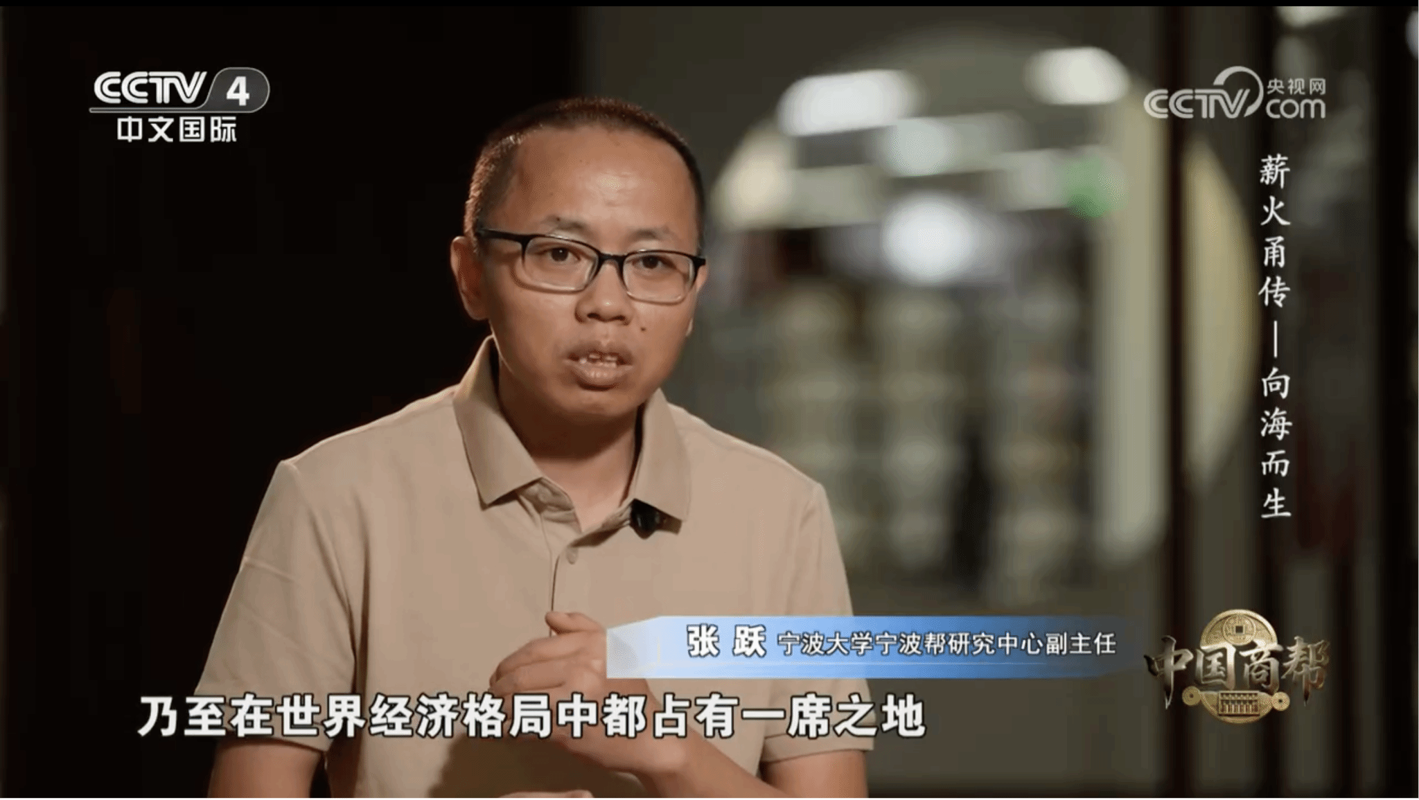 近日,由中央广播电视总台与中共宁波市委宣传部联合打造的大型系列纪录片《中国商帮之薪火甬传》在CCTV-4中文国际频道播出。我院张跃副教授受邀参与节目录制,并在第一集《向海而生》中出镜接受采访。