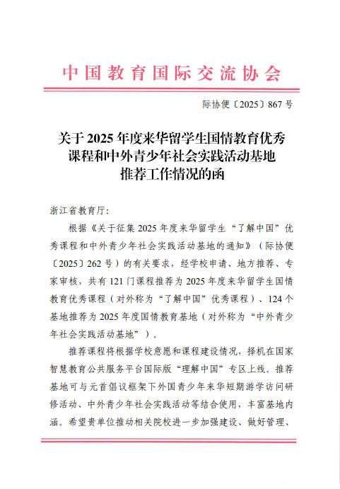 此外,《中国文化》课程还入选了2025年度来华留学生国情教育优秀课程。作为团队自编的《中国文化概况》(中英文版)教材的配套课程,《中国文化》此前也已入选教育部“拓金”计划示范课程、中文联盟金课、浙江省国际化一流课程、中国—中东欧国家教育交流网学习课程等。这标志着我院在中华文化国际传播与留学生教育融合方面取得重要突破,课程质量与教学成效获得国家级认可。