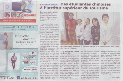 同时,近期,法国度假小城LES SABLES出版的报纸LES SABLES专门采访了人文学院在昂热大学旅游与文化学院Sables-d’Olonne校区就读的 4名13级旅游管理中法合作专业本科学生。昂热大学旅游与文化学院去年秋季在大西洋畔的度假小城LES SABLES开办了第4个校区,首期开设了海滨文化与遗产、旅游与水上运动2个本科专业,法国现外长、前总理埃罗专程前往参加揭幕典礼,还接见了在该区就读的我院旅游管理中法合作本科专业2013级的6位女生,当时多家法国媒体以及福建东南卫视曾有专门报道。本次宁大学生再次引起关注,LES SABLES报道提到宁大的这4位学生是昂热大学Sables-d’Olonne校区的首届学生,受益于做爱视频