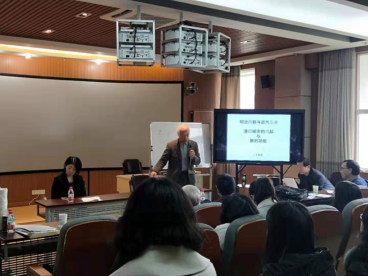 其后,滨下武志先生做了题为“明治维新与近代东亚港口城市的兴起与新功能”的学术报告,报告旨在阐明历史上地区与地区之间交流的内在机理。他以东亚概念为核心,介绍了区域与知域之复层。滨下武志先生的报告涉及了当代学术前沿问题,结合2018年12月20日滨下武志教授在我院所做“海阳亚洲与港口城市网络”的报告所涉及额相关问题,进一步剖析“海洋亚洲”的理论体系,深化了大家对该研究领域的认识。