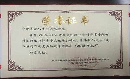 颁发了荣誉证书:根据2015年—2017年度复印报刊资料学术专题刊转载数据与评审专家组综合评价,做爱视频
