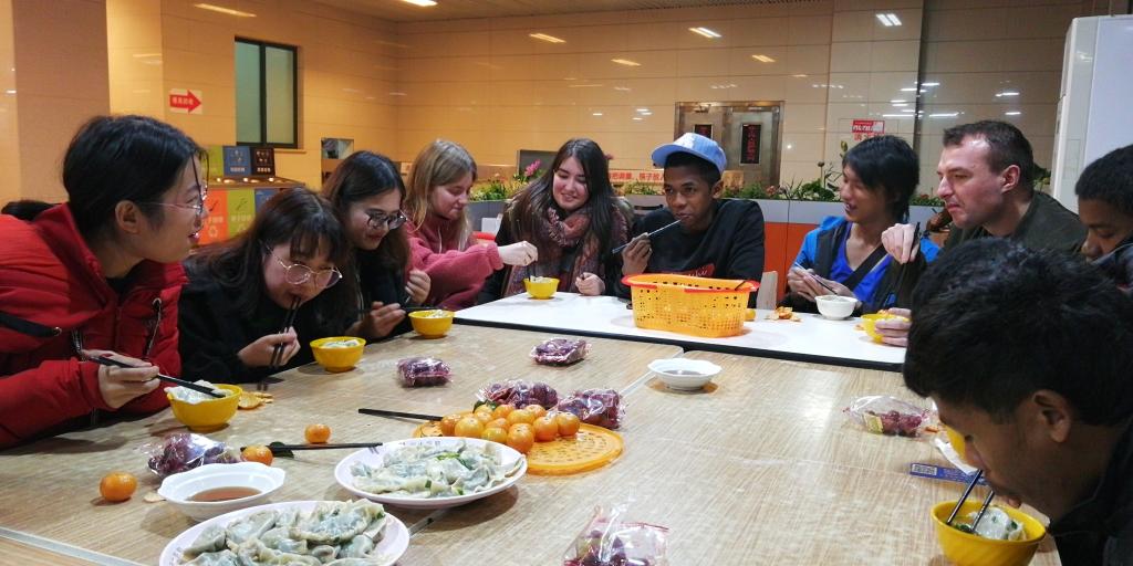 在华厨师长的帮助下,大家一起包的饺子很快就出锅了,在热气腾腾的餐桌上,毛海莹老师为大家介绍了中国人吃饺子习俗的起源和发展,大家深刻体会到了“团圆”的意义。毛老师还给大家带来了适合在冬天吃的红枣和金桔,从一旁路过的同学都投来了极度羡慕的眼神。