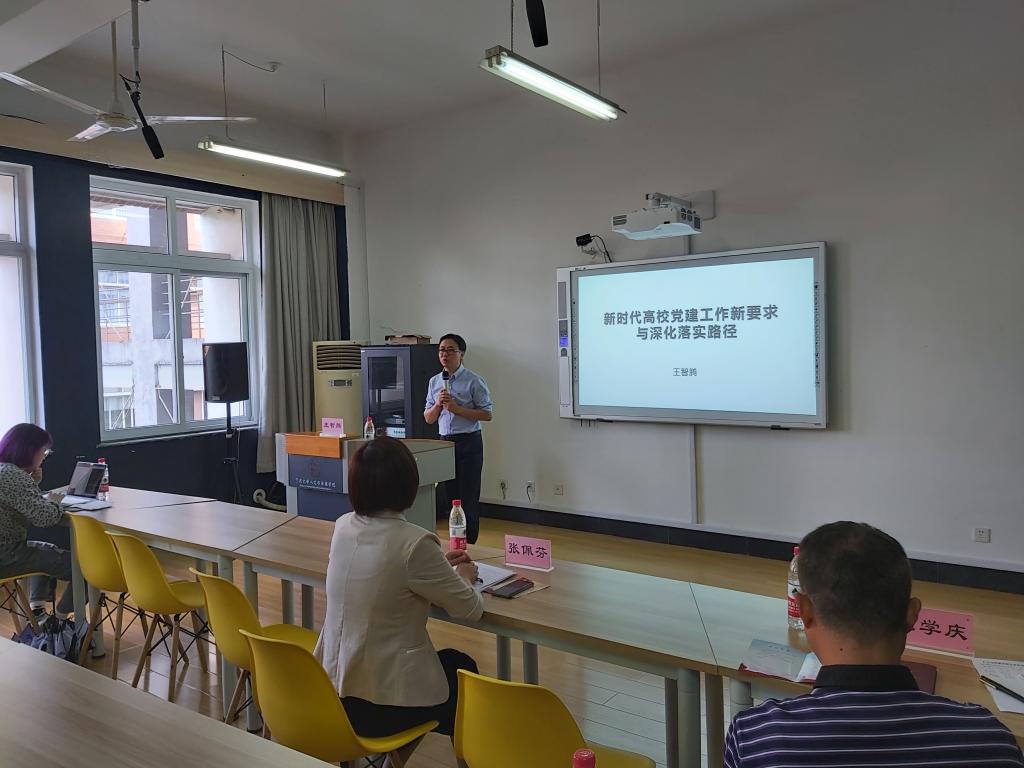 首先由校党委组织部副部长王智腾做的题为《新时代高校党建工作新要求与深化路径》的专题报告,他从新时代高校党建工作的新要求和新要求的落实路径两个方面重点阐述了如何提升基层各级党组织的组织能力,强化党组织的政治作用;党支部如何强化党建引领能力,促进党建与业务的融合发展和相互促进。随后是全国高校党建工作样板党支部--我院历史系本科生党支部指导老师汪盛科的《党支部活动的策划与组织--“炼忠魂、铸史魂”微党课群为例》,他以历史系本科生党支部为例,向培训学员分享了该支部特色和先进的党建工作方法,并对学院各支部的“一支部一亮点”进行和点评和分析。