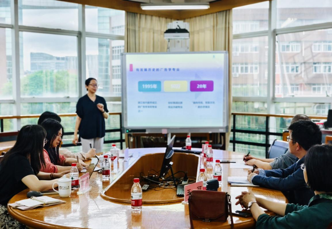 的学系建制和专业建设特点做了深入描述。王丽教授围绕新闻传播学系学科发展和专业建设做了全面系统的介绍;庞菊爱副教授就广告学专业建设的现状与前景、产学研品牌项目“对话广告人”的运营和管理做了周到细致的分享;汤志耘副教授围绕国家精品在线课程“好玩的广告学”,从课程设计、互动交流以及联通业界等角度,为客人详尽介绍了国家精品在线课程的建设思路和经验。