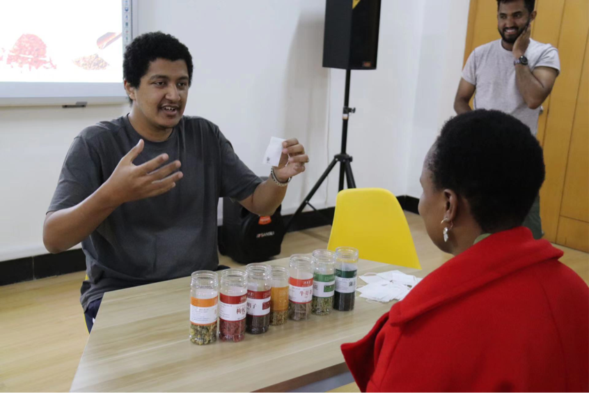 讲座伊始,毛老师向在场的留学生们介绍了中医文化的由来、发展历史和中医的诊疗法,并拿出特意带来的刮痧板、玻璃罐和艾灸贴,通过生动的讲解和操作示范将中医的几种诊疗法和养生之道分享给在场的留学生。紧接着汉硕同学齐上阵,将准备好的药材分发给每个小组,并向留学生介绍每种药材的名字,功效及组合搭配。菊花、枸杞、决明子、金银花……清热、降火、消炎、解毒……现场讨论热烈,汉硕同学与留学生积极互动,博大精深的中医文化在真实可感的体验实践中,走进了每个留学生的心中。